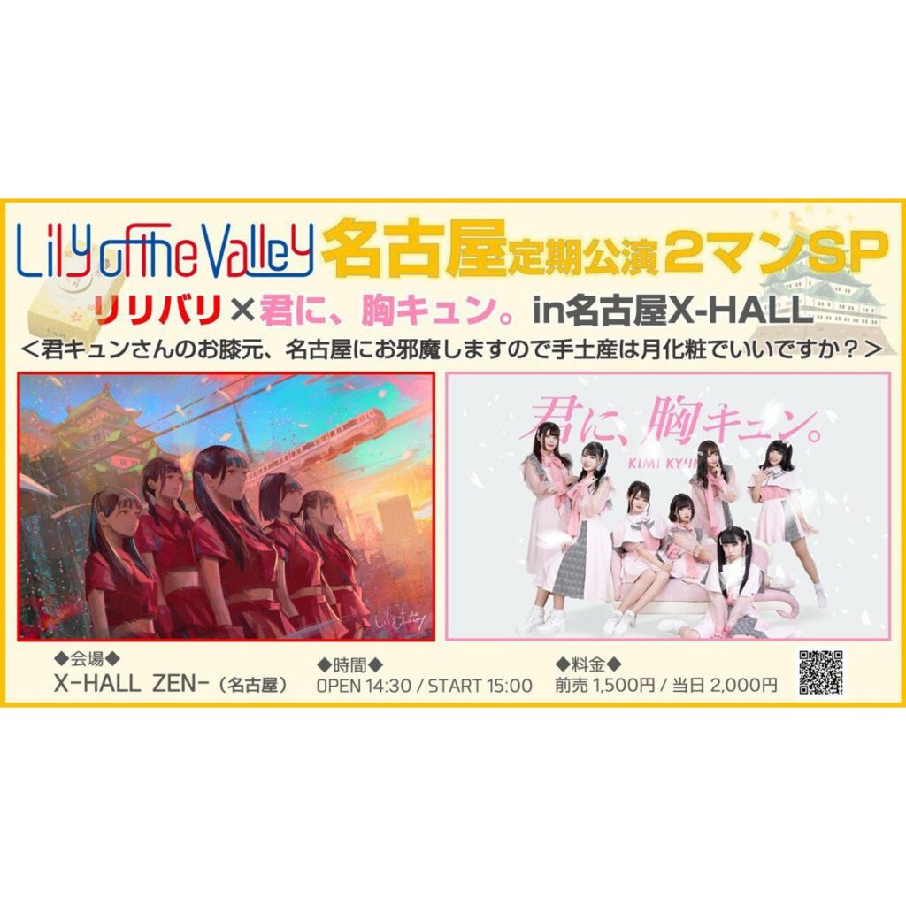 ◆日程:2020年3月14日(土) ◆時間:OPEN 14:30 / START 15:00 ◆会場:X-HALL -ZEN- ◆出演者:Lily of the valley / 君に、胸キュン。 ◆料金:前売 ¥1,