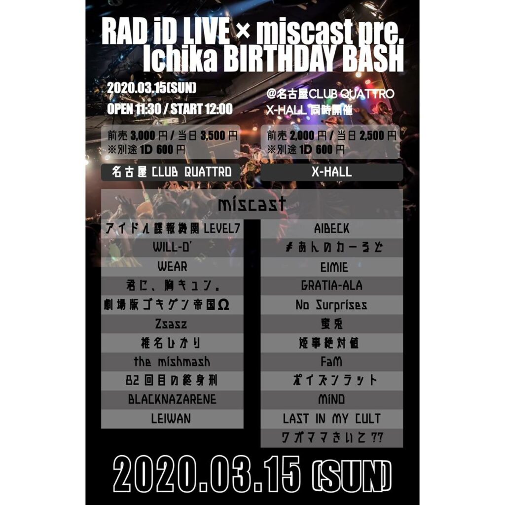*入場整列順 *X-HALLにて同時開催のイベント入場されてると入場の際、チケット¥1,000 OFF 出演者 miscast / BLACKNAZARENE / WILL-O’ / 君に、胸キュン。 / W