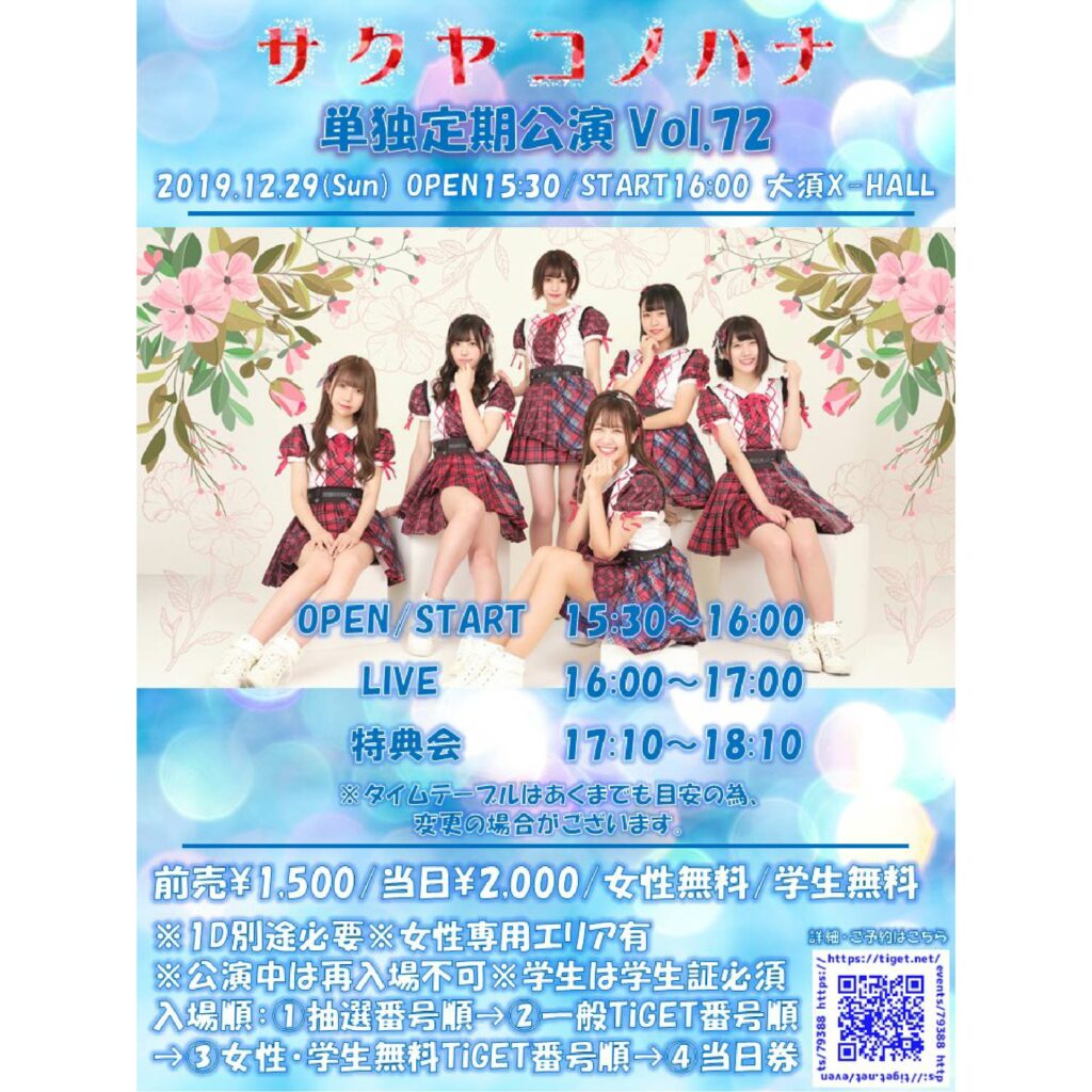 『サクヤコノハナ 単独定期公演 vol.72』 会場:大須X-HALL 時間:開場15:30/開演16:00 料金:前売1,500/当日2,000円/女性無料/学生無料(全て+1D) ※女性専用エリア有 ※公演中は