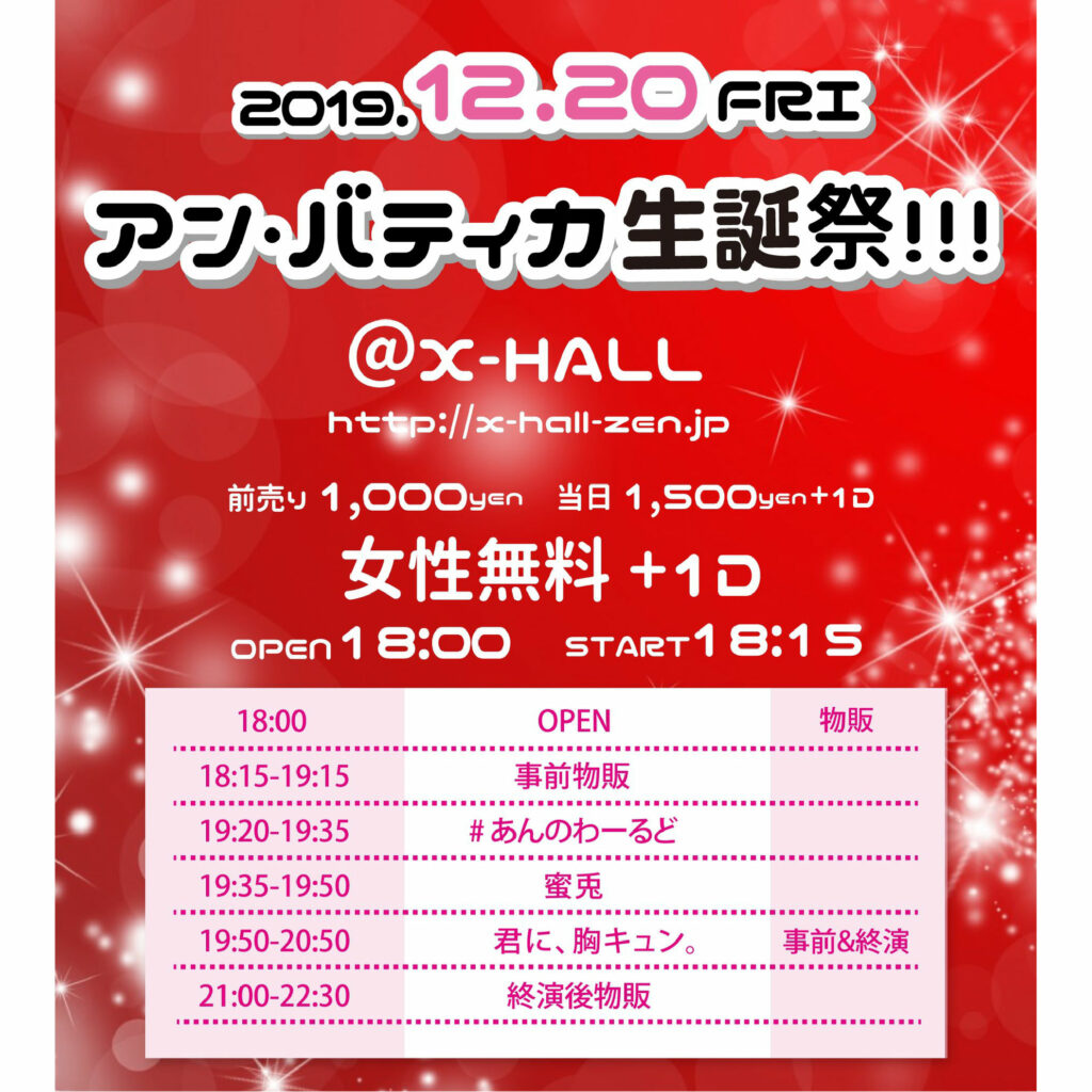 12月20日(金) アン・バティカ@X-HALL【夜】 『アン・バティカ生誕祭!!』 ■会場 X-HALL ■料金 前売1,000 / 当日1,500 / 女性無料(+1D) ■出演 君に、胸キュン。/ 蜜兎 / #あん