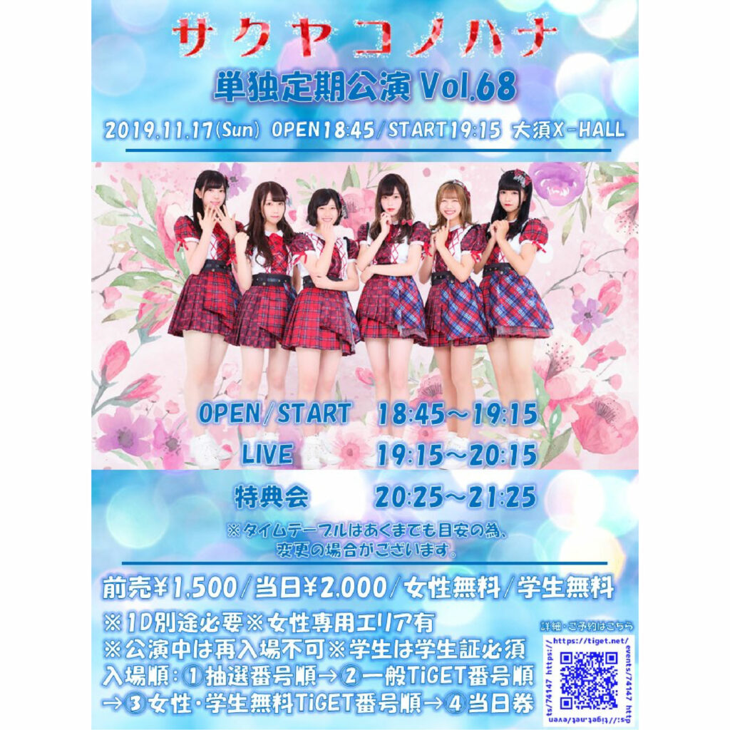 『サクヤコノハナ 単独定期公演 vol.68』 http://tiget.net/events/74147 会場:大須X-HALL 時間:開場18:45/開演19:15 料金:前売1,500/当日2,000円/女性無料/