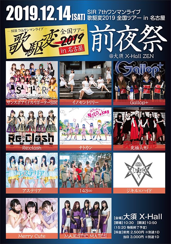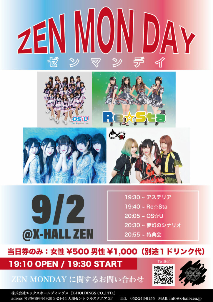 【日時】 9月2日(月) 19:10 オープン / 19:30 スタート 20:55 特典会 / 22:00 クローズ 【出演】 アステリア / Re☆Sta OS☆U / 夢幻のシナリオ 【料金】 当日のみ ¥1,00
