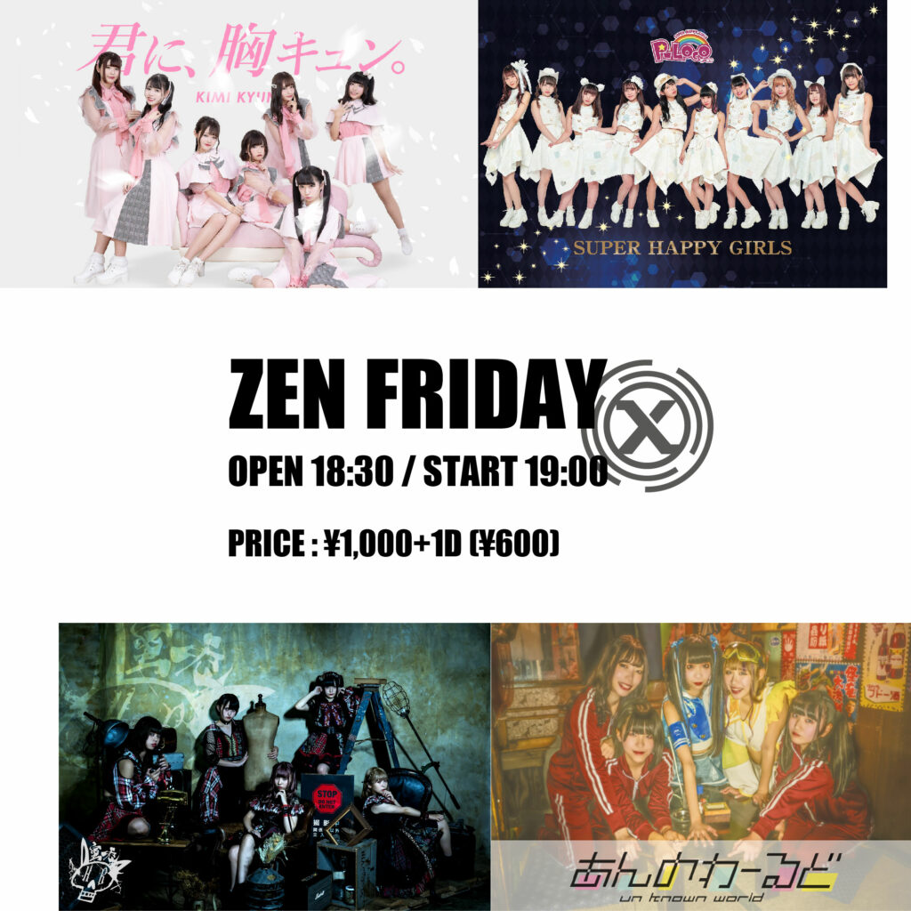 【ZEN FRIDAY】 2019年11月15日(金) 会場:X-HALL ZEN(名古屋・大須) 時間:開場18:30 / 開演19:00 料金:当日のみ1,000円+1D(¥600) 出演:君に、胸キュン。/ P-L